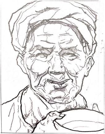 问答题 用线条勾勒出罗中立油画作品《父亲》的构图样式、主体形象及标志性细节,并简述其艺术特点。