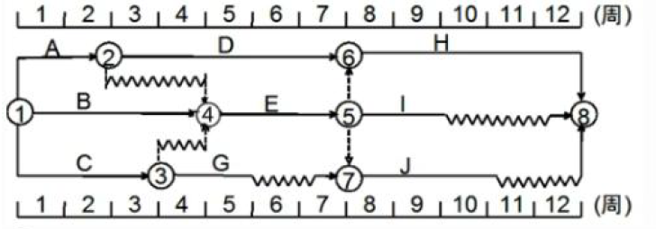 某工程双代号时标网络计划如下图所示,其中工作C的总时差和自由时差分别为( )周。
