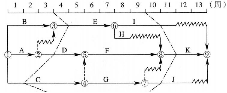 某工程双代号时标网络计划执行到第3周末和第9周末时,检查其实际进度如下图前锋线所示,检查结果表明()。