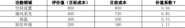 某住宅建筑部分分四个功能区域,将该类住宅建筑部分按当地合理造价 2000 元/平方米确定为初始总成本。经分析计算各功能区