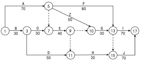 为改善项目使用功能,业主进行了设计变更,该变更增加了Z 工作(持续时间50 天),根据施工工艺要求,Z 工作为A 工作的紧后工作、为G 工作的紧前工作。项目部根据要求重新绘制了网络图。