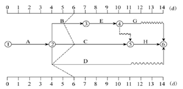 某分部工程双代号时标网络图计划执行到第6d结束时,检查实际进度前锋线见下图,检查结果表明( )。