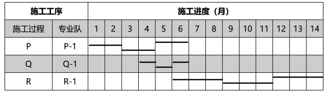 4.根据题意可知,事件 3 中,H 工作组织异节奏流水施工时,P、Q 之间步距为 4 月,Q、R 之间步距为 1 月,所以,P、Q 之间存在 1 个月搭接时间,Q、R 之间存在 1 月间歇时间。
