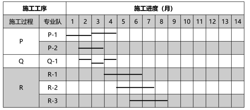 H 工作的工期=〔3+(2+1+3)-1〕×1+1-1=8 个月,工期可缩短=14-8=6 个月。调整后 H 工作的施工横道图,见表。