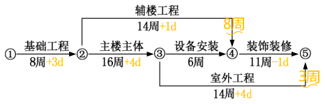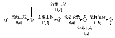 案例题 某办公楼由 12 层主楼和 3 层辅楼组成。施工单位(乙方)与建设单位(甲方)签订了承建该办公楼施工合同,合同工期为 41周。合同约定,工期每提前(或拖后)1d奖励(或罚款)2500 元。乙方提交了粗略的施工网络进度计划,并得到甲方的批准。该网络进度计划如图 1 所示。
