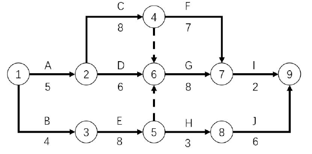 2.(1)关键线路为A→C→G→I 或①→②→④→⑥→⑦→⑨(2)5+8+8+2=23,总工期为23 天。