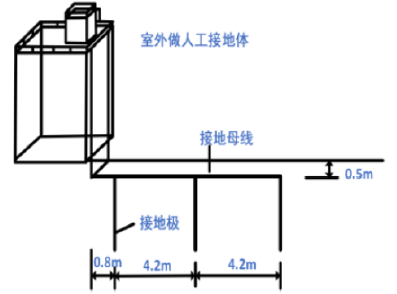 (2)图中接地极间距4.2米不符合规定。圆钢、角钢、铜管、铜棒、铜管等接地极应垂直埋入地下,间距不应小于5m。