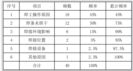 3.管道焊缝气孔超标的主要原因是:焊工操作原因、焊条未烘干为 A 类,是影响气孔质量的主要因素;焊接环境影响为 B 类次要因素。