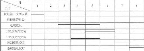 2.泛光照明工程施工进度计划的编制应考虑的因素有:以幕墙施工进度为依据来制订泛光照明的进度计划;进度计划要符合连续施工的要求;要注意保证施工重点,兼顾一般;要全面考虑施工中各种不利因素的影响。