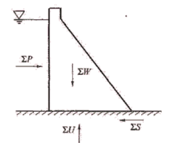 某重力坝的抗滑稳定计算受力简图如图所示,已知水压力、自重、扬压力分别为 5KN、100KN、10KN,摩擦系数为 0.0
