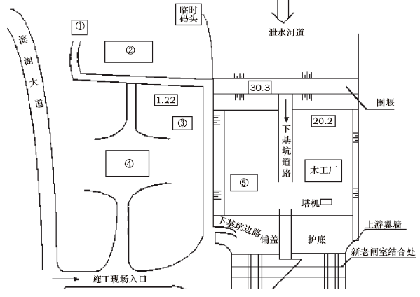 (3)①油库;②混凝土拌合系统;③机修车间;④办公生活区;⑤钢筋加工厂。