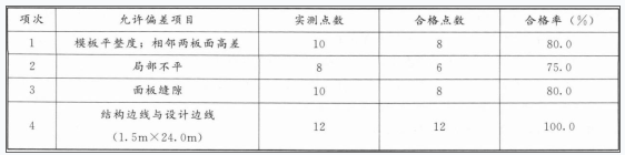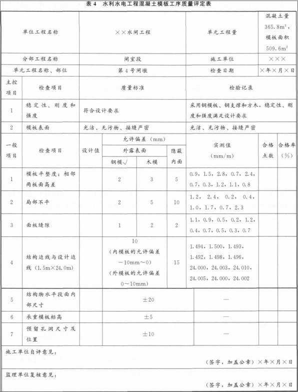 1.承包人在闸墩模板及支架设计时,漏列的基本荷载:人员及设备、工具等荷载;新浇混凝土的侧压力;混凝土拌合物人仓所产生的冲击荷载。 2.评定表中相应数据见下表。