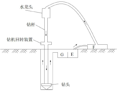 钻孔施工的钻孔及泥浆循环系统示意图如图2-1 所示,其中标明了钻头、钻杆、钻机回转装置、水龙头,泥浆循环如图中箭头所示方向。