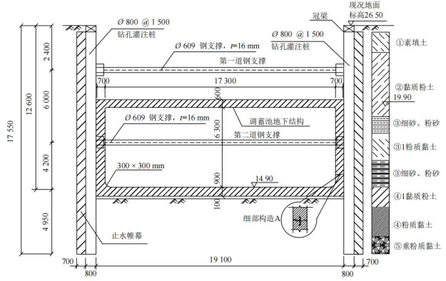 1.地面标高为 26.5m,地下水埋深 6.6m,因此地下水位标高为 26.5-6.6=19.9m;止水帷幕在地下水中高度为 19.9-(26.5-17.55)=10.95m;因此止水帷幕在地下水中的高度为 10.95m。