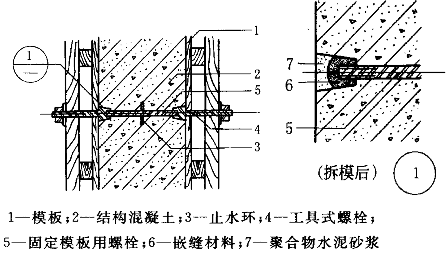 4.在池壁形成的螺栓锥形槽,应采用无收缩、易密实、具有足够强度、与池壁混凝土颜色一致或接近的材料封堵,封堵完毕的穿墙螺栓孔不得有收缩裂缝和湿渍现象。