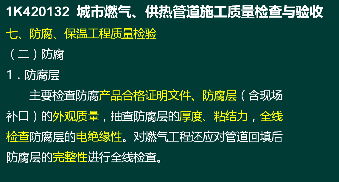 解析:按照题目案例背景,直埋段成品防腐钢管到场后,厂家提供了管道的质量证明文件,项目部质检员对防腐层厚度和粘结力做了复试,经检验合格后,开始下沟安装,由此可知,本题目主要考查钢管防腐层质检项目。主要检查防腐产品合格证明文件、防腐层(含现场补口)的外观质量,抽查防腐层的厚度、粘结力,全线检查防腐层的电绝缘性。
