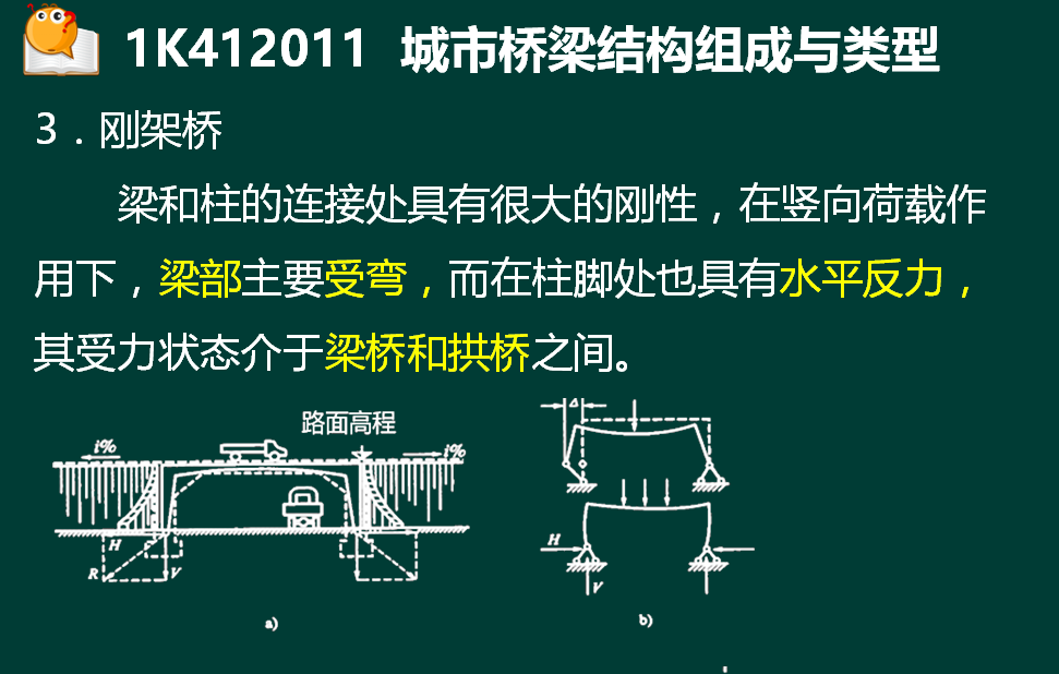 2.钢架桥;梁和柱的连接处具有很大的刚性,在竖向荷载作用下,梁部主要受弯,而在柱脚处也具有水平反力,其受力状态介于梁桥和拱桥之间。