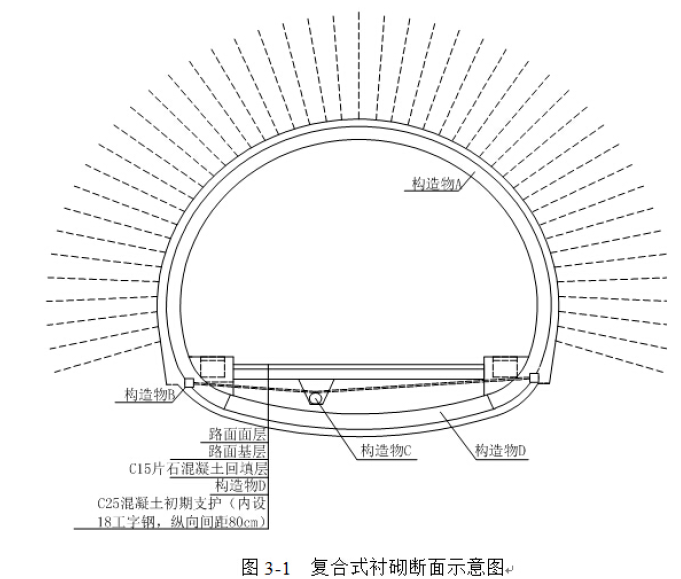 (2)A是二次衬砌,B是排水盲沟,C是中心排水管沟,D是仰拱。