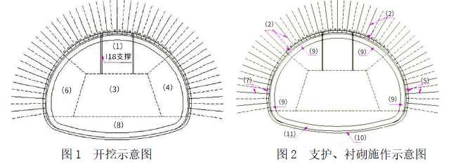 环形开挖留核心土法可用于Ⅴ~Ⅵ级单洞双车道(或一般跨度)隧道中,也可用于Ⅲ~Ⅳ级单洞三车道(或中等跨度)隧道中。