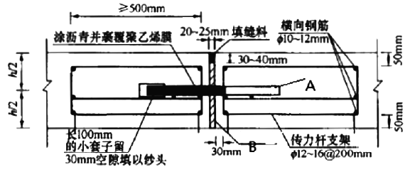 4.A—传力杆,B—胀缝板。A应该采用光面钢筋。纵向施工缝构造形式为设拉杆平缝型。