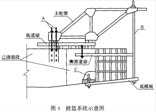 挂篮系统中A、B、C各部件的名称如下:A:锚固钢筋装置;B:前吊带装置;C:底模后吊带装置。
