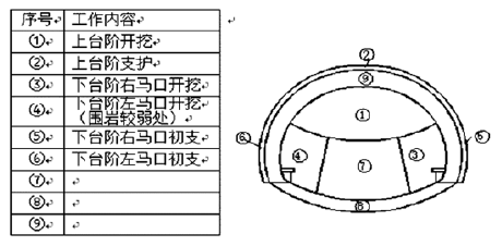 表列⑦ 项为核心土开挖,⑧ 项为施工仰拱,⑨ 项为施作二次衬砌。
