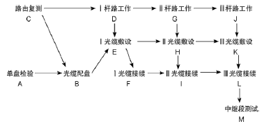 案例题 某施工单位承接架空线路全长120km,分为三个中继段,采用G652光缆,项目部根据现场摸底报告、资源配置计划和施工定额,编制了进度计划,项目部在计划制定过程中进行工作分解,时间估算,责任分工和作业排序见表,一个队同时只能做一项工作,并制定双代号网络图,部分网络图见图