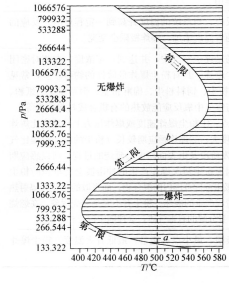 下图为氢和氧混合物(2:1)爆炸区间示意图。其中a点和b点的压力分别是混合物在500℃时的爆炸下限和爆炸上限。随着温度的