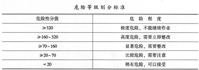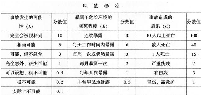 在运用工作危害分析方法进行风险评估时,常采用作业条件危险性评价法对危险进行评估(LEC法)。根据LEC法赋权标准(下表)