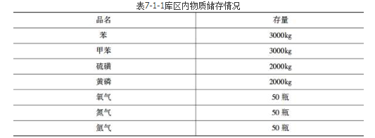 不定项选择题 某危险化学品储运公司拥有一个危险化学品库区,内设有3个危险化学品仓库,一个存有苯、甲苯、硫磺、黄磷四种易燃物质;一个存有氧气;一个存有氮气、氩气等气体。库房总面积约500m2。该库区设有安全领导小组、义务消防队及专职安全机构等。公司职工共16人,其中技术管理人员3人、安全管理人员7人。库区内各种物质储存情况如表7-1-1所示。
