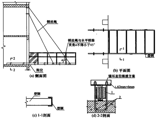 正确做法:平台每侧前后两道斜拉钢丝绳应固定在该侧的不同的预埋锚环上。
