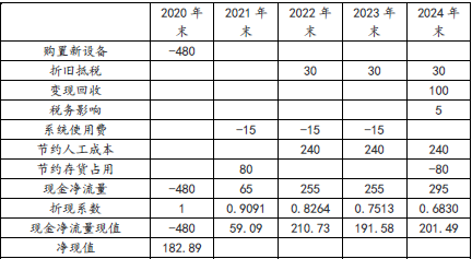 (2)折现回收期=3+(201.49-182.89)/201.49=3.09(年)