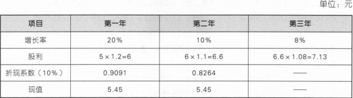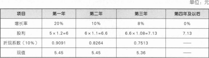 高速增长期股利现值=5.45+5.45=10.9(元),