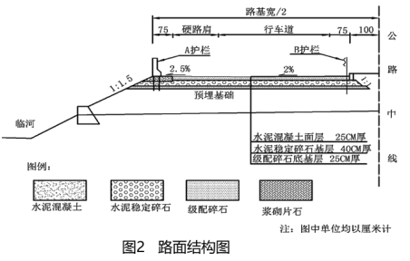 案例题 某施工单位在南方旅游区承建某一级公路水泥混凝土路面工程,起讫桩号为K0+000~K22+000,当地建筑材料充足。该公路设计速度为80km/h,双向四车道,单车道宽度为3.75m,硬路肩宽度为2.5m。公路左侧临河,填方路堤高度为3~5m,临河侧及中央分隔带侧均设置了安全防撞护栏。该工程主要的施工项目有级配碎石底基层、水泥稳定碎石基层、水泥混凝土面层、中央分隔带、路面防排水及交通安全设施等。路面结构如图2所示。施工过程中发生了如下事件: