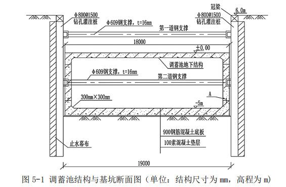 案例题 某市区进行城市“海绵化”改造施工,新建雨水调蓄池用于调节雨期管渠峰值流量,调蓄池为地下式现浇钢筋混凝土结构,混凝土强度等级 C35, 平面尺寸为 60m×18m。场地地下水类型为潜水。设计基坑长 62m,宽 19m, 深 12m。围护结构采用Φ800mm 钻孔灌注桩排桩+2 道Φ609mm 钢支撑,桩顶设置钢筋混凝土冠梁。基坑围护桩外侧采用高压喷射注浆止水帷幕,对围护桩形成包覆,如图所示