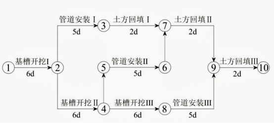 因征地手续延误,沟槽开挖晚了半个月。为满足工期要求,建设单位要求施工单位调整施工计划。施工单位将基槽开挖、管道安装、土方回填由顺序施工改为流水施工。每个工序划分为三个施工段。根据合同工期要求绘网络进度图如下所示