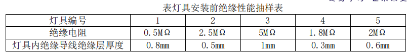 灯具施工时,作业班组按照技术交底的要求对灯具的绝缘性能现场抽样检测抽样结果如下表所示。