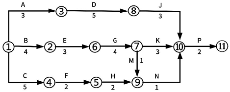 (2)4+3+4+3+2=16 天;关键线路:B→E→G→J→P 和 B→E→G→K→P。
