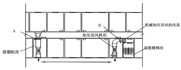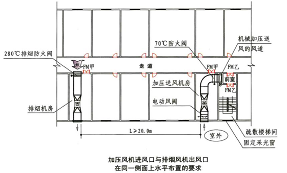 3.(1)A为排烟防火阀(280℃),B为防火阀(70℃)。送风机进风口不应与排烟风机出风口设在同一面上,当设在同一面时,两者边缘的水平距离不应小于20m,不足20m的排风口应高出进风 口边缘 6m。 (2)排烟系统风管的最小厚度按高压系统选择。