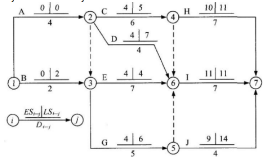 某工程双代号网络计划如下图所示,已标明各项工作的最早开始时间(ESi—j)、最迟开始时间(LSi—j)和持续时间(Di—j)。该网络计划表明()。
