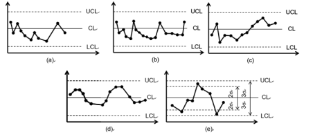 图(e)所示生产过程不正常。理由:接近控制界限指点子落在界限附近,如连续3点至少有2点接近控制界限,7点至少3点,10点至少4点。本图属于连续7点3点接近控制界限,属于接近控制界限型异常。