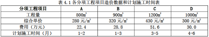拟完工程计划投资=(计划 A 分项 22.4+计划 B 分项 28.8+计划 C 分项 51.6/3(三个月平均))×(1+7%)×(1+9%)(1 分)=79.775 万元