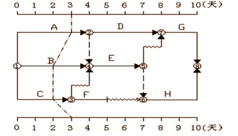某分部工程时标网络计划如下图所示,当计划执行到第三天结束时检查,实际进度前锋线如图所示,检查结果表明( )。