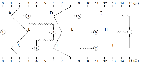 某工程时标网络计划执行到第2周及第8周末时,检查实际进度执行情况中前锋线所示,检查结果表明()