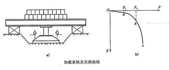 不定项选择题 采用浅层平板载荷试验检测某桥梁工程地基承载力和变形模量。已知该工程地基土为淤泥质土,泊松比为0.41,试验加载和测试装置如下图a)所示,实测荷载一沉降关系曲线如图b)所示。试完成下列有关浅层平板载荷试验的问题。1)图b)中,oa段曲线表示的是( )。