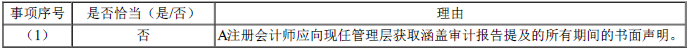 (1)2022年10月,甲公司更换了主要管理层成员。由于现任管理层仅就其任职期间提供书面声明,A注册会计师向前任管理层获取了其在任时相关期间的书面声明。