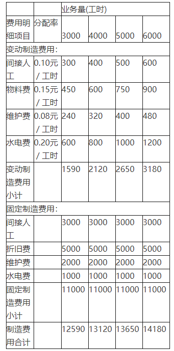 (4)维护费:当生产能量在3000工时至6000工时的相关范围内,基数为2000元,另加每工时应负担0.08元;