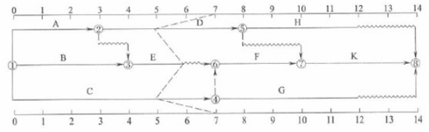 不定项选择题 某工程的双代号时标网络计划如下图所示(时间单位:周)。假定各项工作均匀速施工,当该工程项目进行到7月底时,检查了该工程的实际进度并绘制了实际进度前锋线,如下图所示。