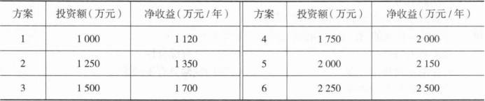 不定项选择题 某公司拟进行项目投资建设,共有六个备选的投资方案。投资的寿命期均为1年,投资额以及1年后的净收益见下表,预计期末净残值均为零。