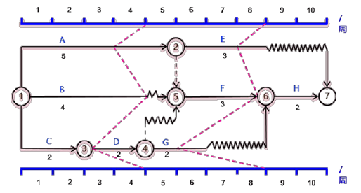 不定项选择题 某双代号时标网络计划图如下图所示:
